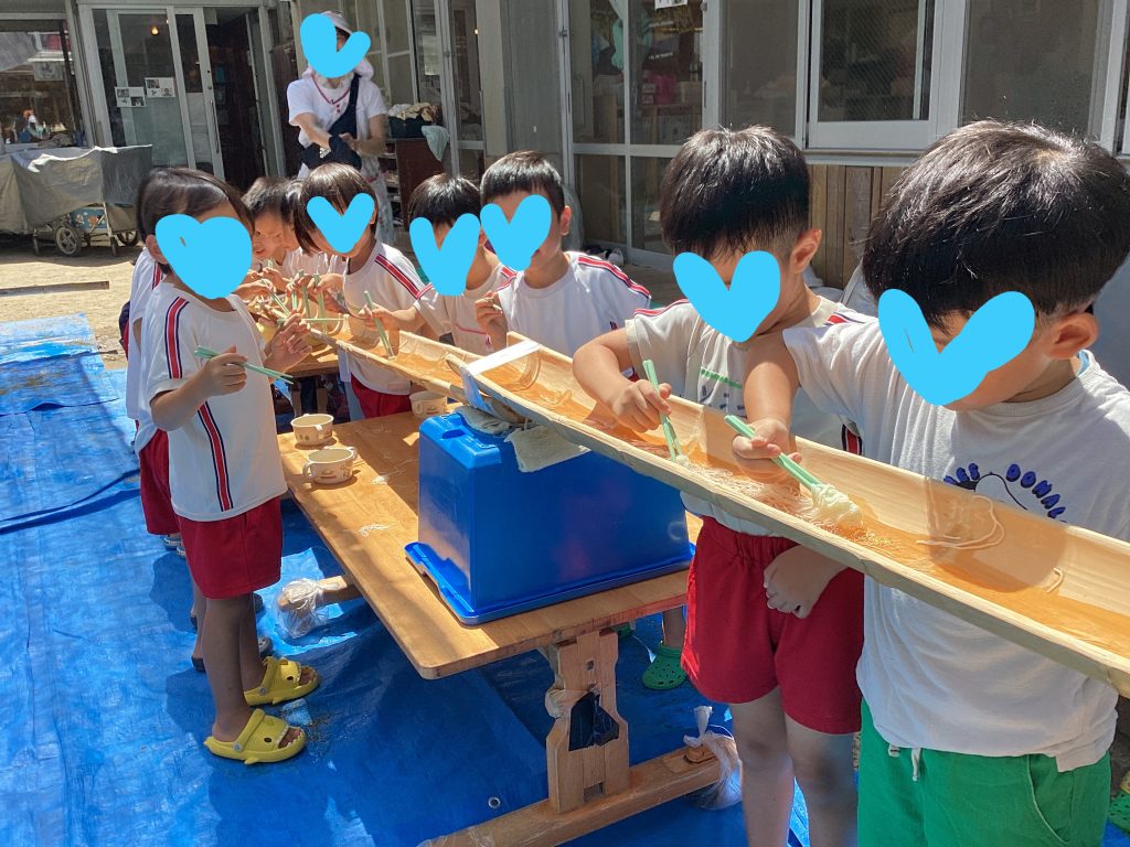 今日はみんなで「そうめん流し」をしました。生まれて初めてそうめん流しを体験するお友達もいて、朝から子どもたちはワクワクドキドキ!いざ、そうめん流しが始まると、上から流れてくるそうめんをとめるのに必死な子どもたちでした。時より流れてくるフルーツも大人気でしたよ!