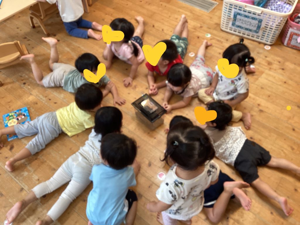 2歳児のクラスでは、くわがたを飼育しています。午前中はよく土の中にかくれているので、子どもたちは目線を下に下にさげて、時にはくわがたに声掛けしながらみんなで観察をしています。